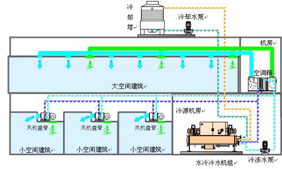 以水冷冷水机组为冷源的中央空调系统由于采用冷冻水传送冷量,空气处理采用风机--盘管系统,这种系统更节能,处理效果好,盘管布置在送风口上方,方便管理和维修,系统的灵活性、年运行费用、安装空间、系统的使用寿命与维护管理等方面均比较具有优势。