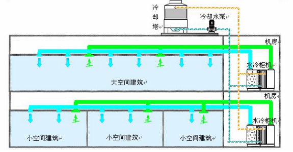 水冷柜机通常适用于夏季炎热,空间需求风量大的场所;水冷柜机可根据客户使用需求选用单独控制或多台集中控制的方式。